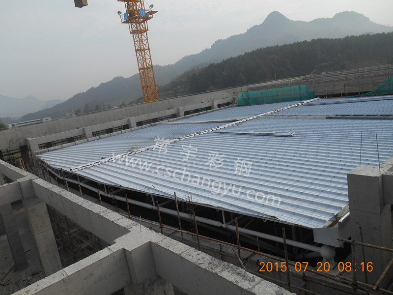 發(fā)布時間:2015-7-29來源:常宇彩鋼作者:常宇彩鋼瀏覽次數(shù):(0) 1.0mm PVDF涂層直立鎖邊鋁鎂錳板應(yīng)用案例 _遵義會堂鋼結(jié)構(gòu)屋面