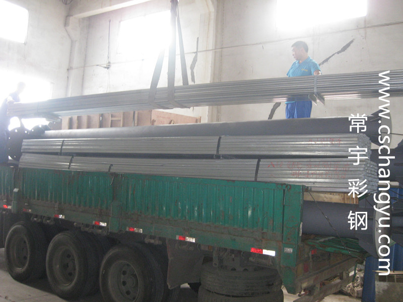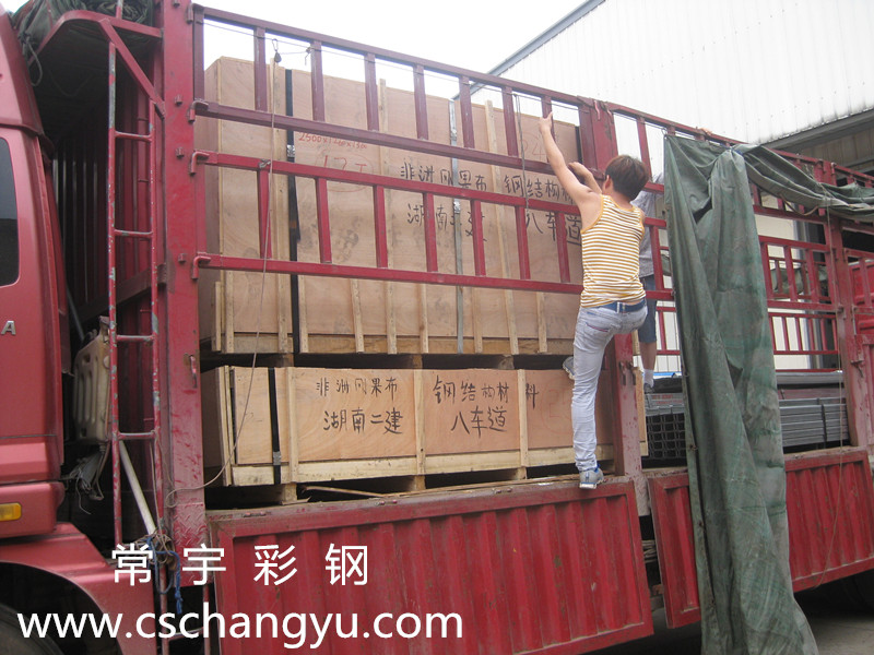2015.6.7長沙常宇彩鋼有限公司第三次出口非洲剛果布 ,其材料為820彩鋼瓦,鍍鋅C型鋼,鍍鋅方管,鍍鋅天溝等。圖為車間裝車實拍圖。