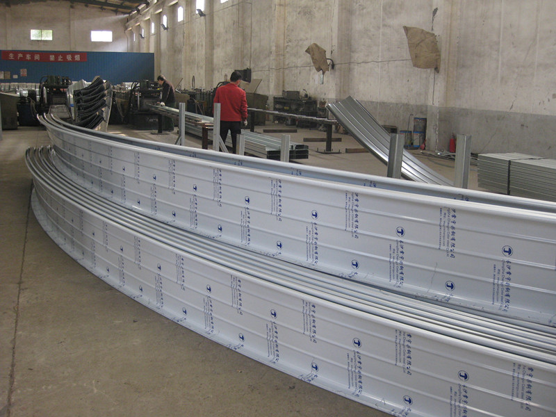 直立鎖邊鋁鎂錳:先直板再?gòu)澔;¢L(zhǎng)8.6m,拱高800mm。