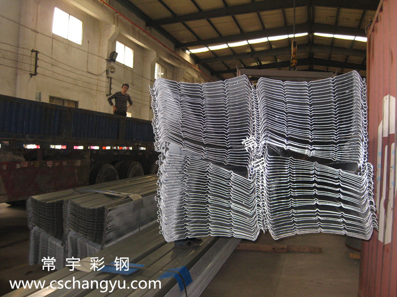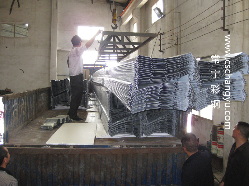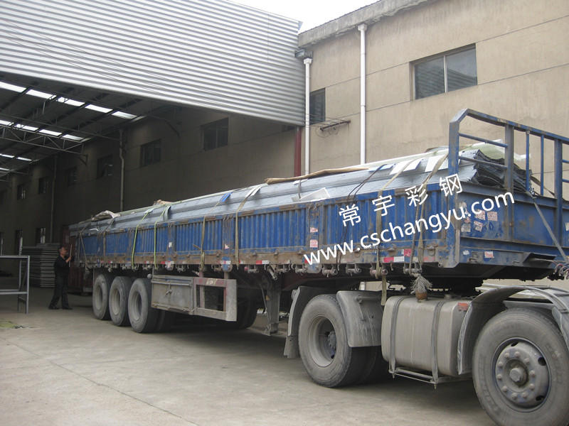 圖為長沙常宇彩鋼直立鎖邊65/430鋁鎂錳板出貨:板長達15米。顏色白銀灰。