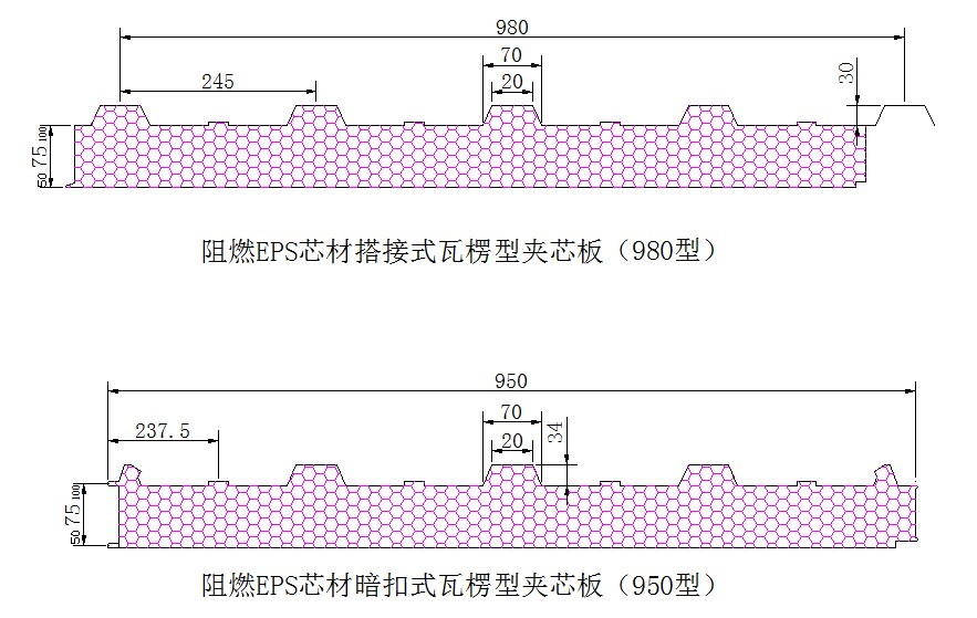 屋面頂板均采用7.5公分980型瓦愣夾芯板。有效寬度是980mm,上海藍下白灰,兩面鋼板厚度0.426/0.326mm。