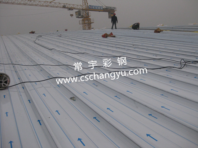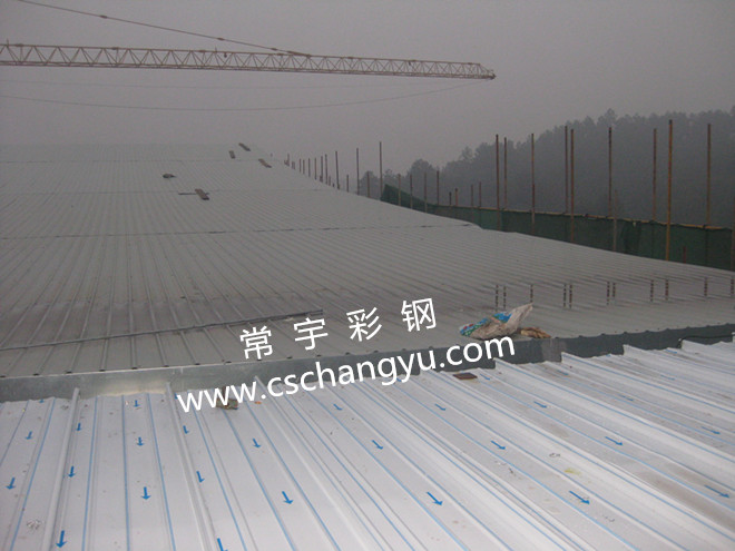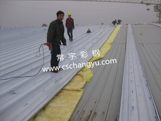 湖南外貿(mào)職業(yè)學(xué)院為網(wǎng)架結(jié)構(gòu)。鋁鎂錳板為現(xiàn)場(chǎng)加工,板長62.8米和40米,總計(jì)6400平方。屋面主檁條C160*50*2.5C型鋼,次檁條C100*70*2.0C型鋼,屋面底板YX15-225-900型彩鋼壓型反壓,屋面面板為YX65-430型直立鎖邊鋁鎂錳板+保溫棉+430型支架。圖為現(xiàn)場(chǎng)實(shí)拍鋁鎂錳板加工、安裝。