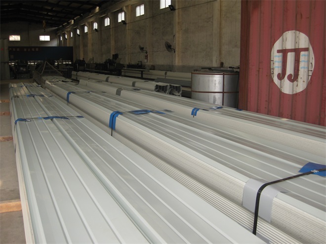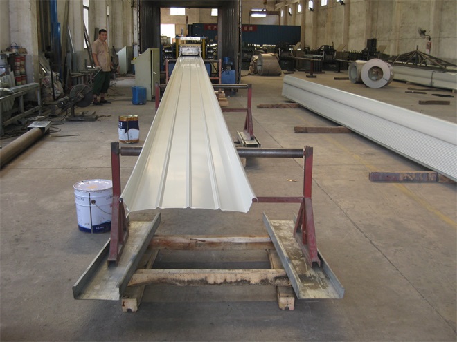 工程材料:YX65/430直立鎖邊彩鋼板、YX15-225-900彩鋼底板、50保溫玻璃棉、鍍鋅支架、脊瓦+四周封邊